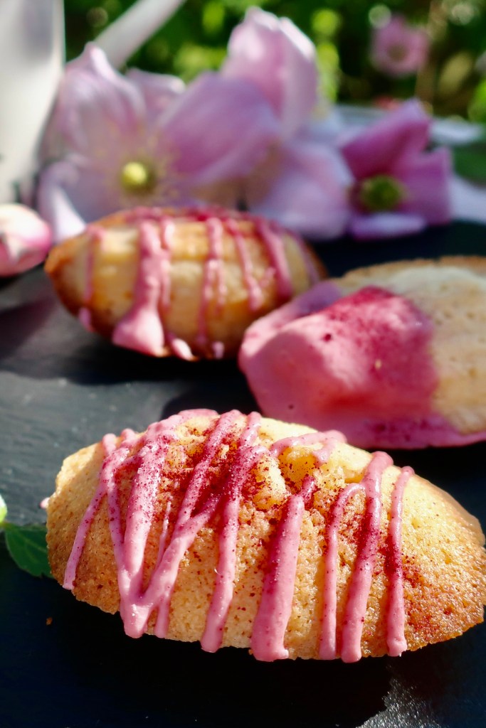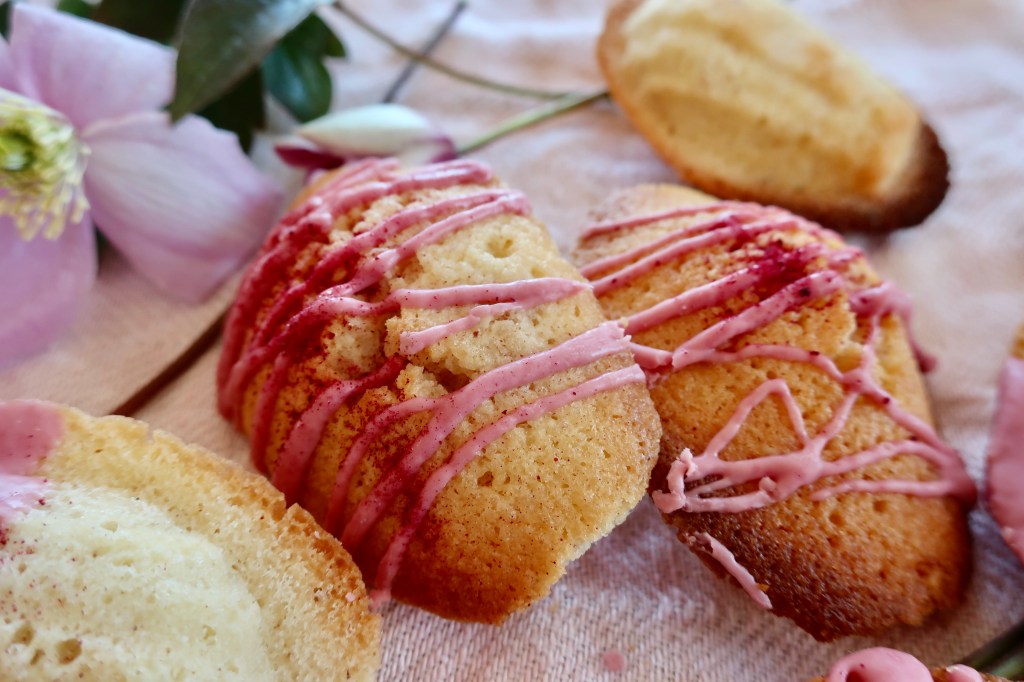 - Ruby Schokolade nach Anleitung schmelzen und in dünnen Streifen über die Madeleines ziehen