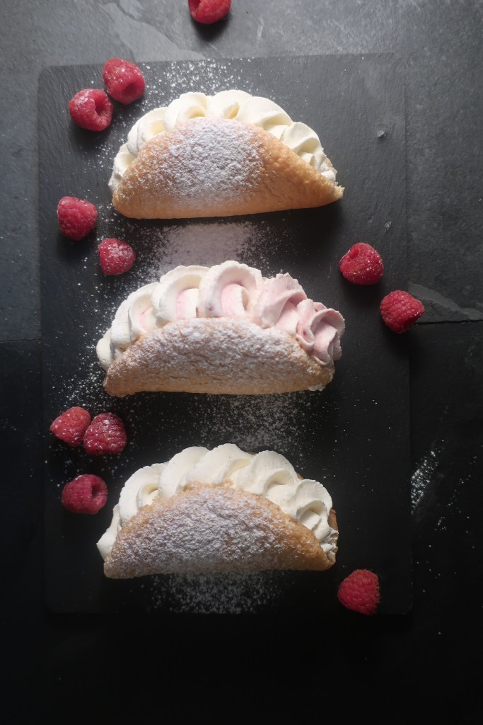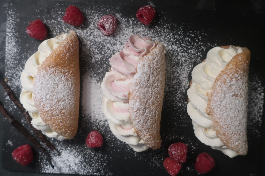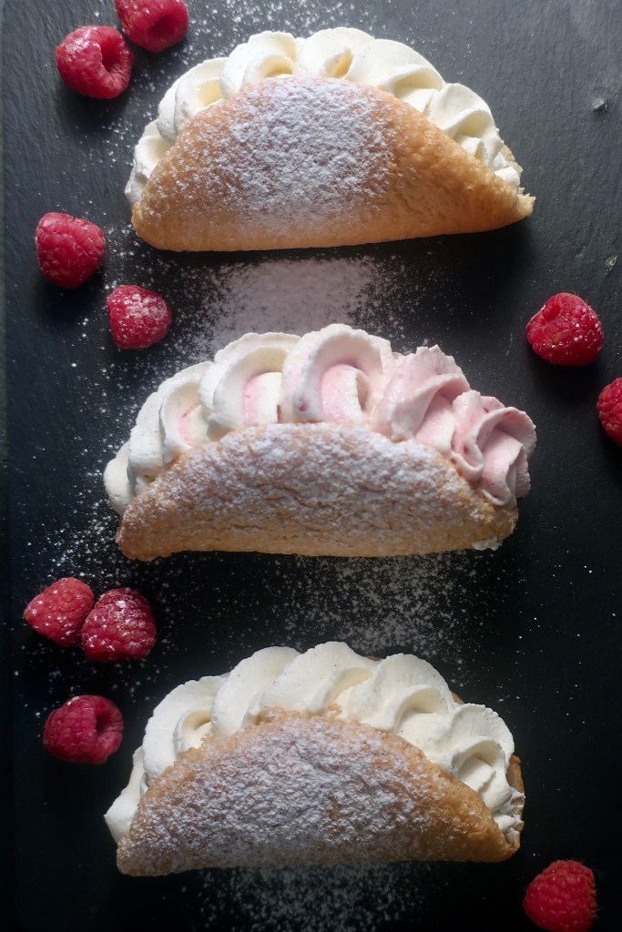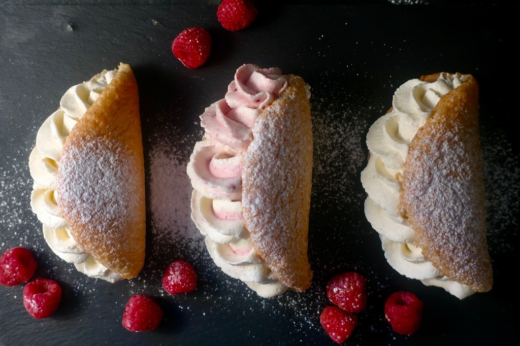 Wenn man Himbeeren und Sahne liebt kommt man an diesem Rezept einfach nicht vorbei. Es ist kein klassischer Kuchen und eignet sich deshalb auch perfekt als kleines Dessert. Gibt es mal keine Himbeeren kann man auch einen Löffel Lemon Curd unter die geschlagene Sahne heben und die kleinen Omeletts mit dieser Mischung und Mandarinen Stückchen füllen – und schon hat man ein frisch-fruchtiges Zitronendessert.