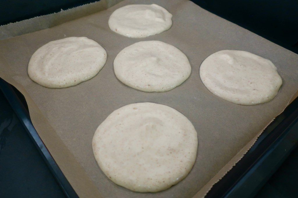 - auf zwei, mit Backpapier ausgelegten Blechen, jeweils 6 Teigkreise aufspritzen