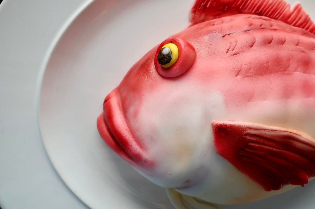 Nun drückt man alles fest, schneidet die Form zurecht und modelliert Mund, Augen, Schuppen etc.