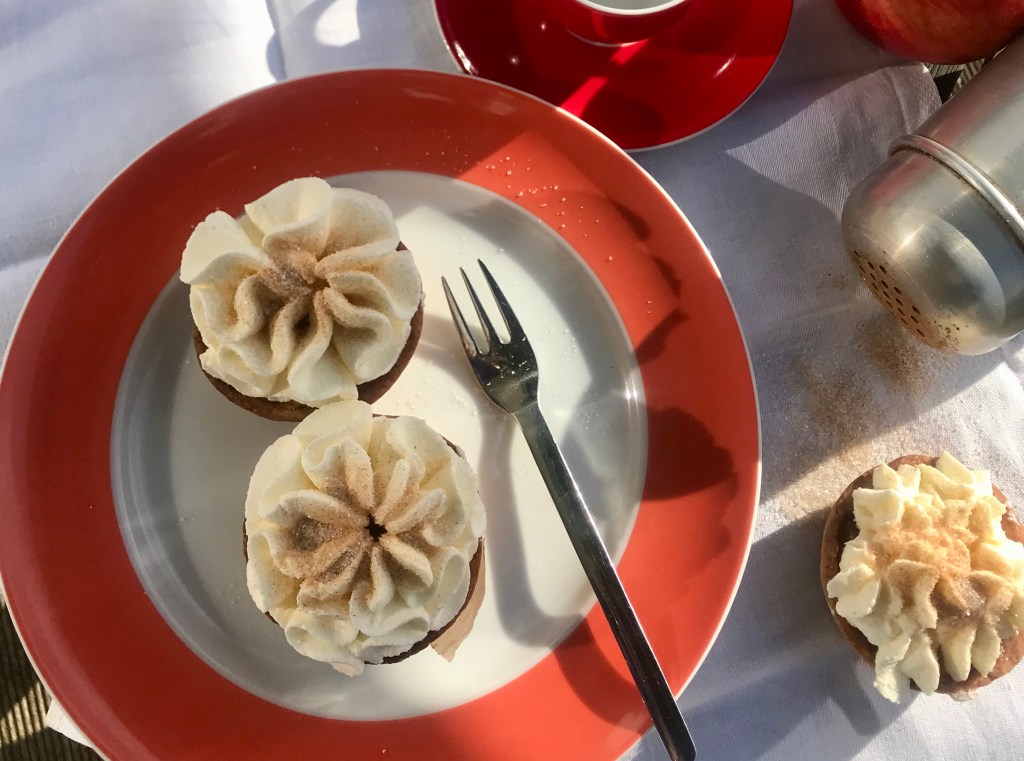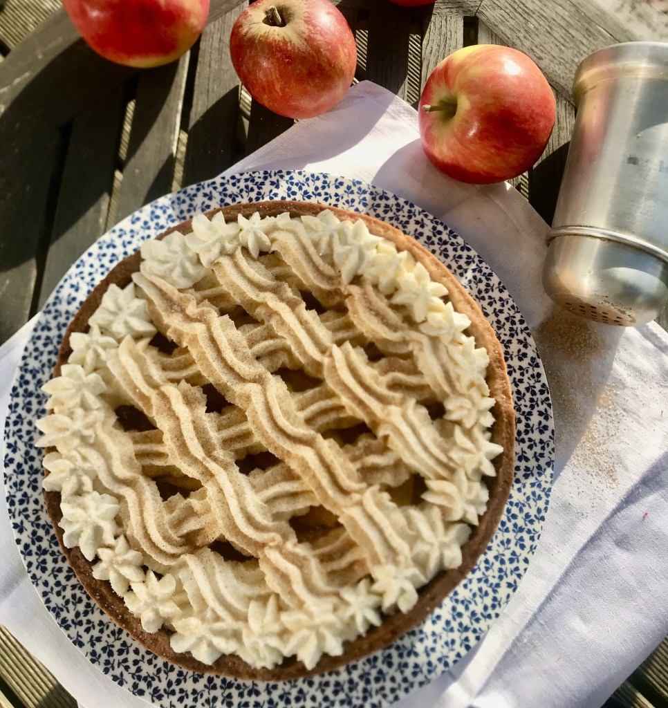 Sahne mit Sahnesteif steif schlagen und auf den abgekühlten Apfelkuchen spritzen.
